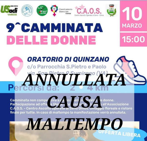 - Stessa sorte anche per la 9^ Camminata delle Donne di Quinzano del pomeriggio del 10/3 è stata annullata causa maltempo.